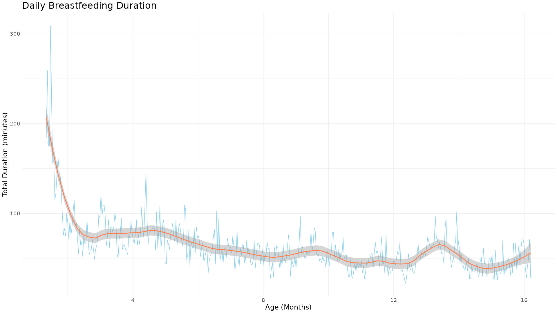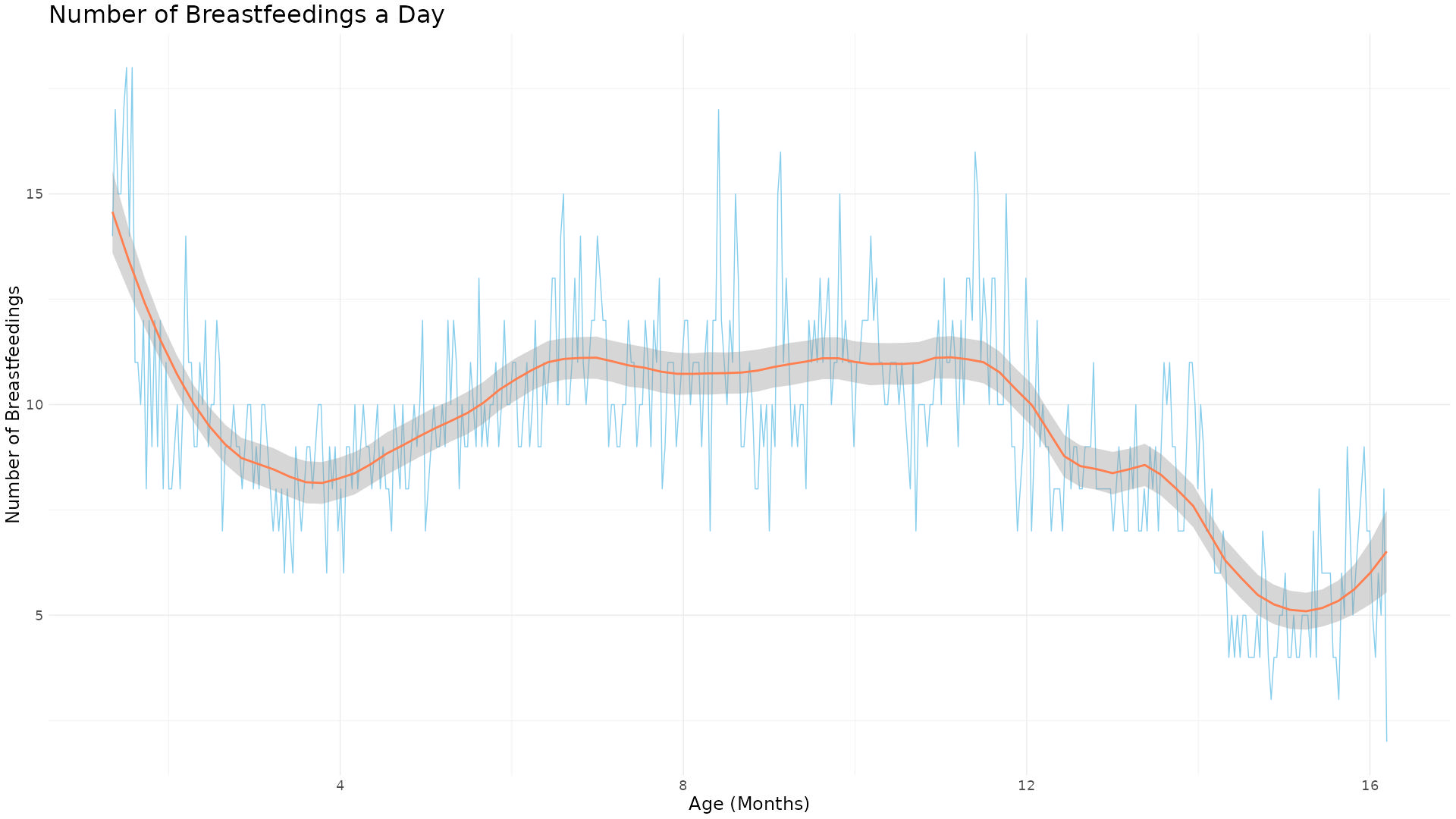 Interestingly, while the duration of breastfeeding has remained relatively consistent, the frequency of breastfeeding sessions has seen more fluctuations. A noticeable increase is evident in the recent months. This could be attributed to her time in kindergarten. However, another contributing factor could be the 15-month vaccine, to which she had a reaction, manifesting as a fever, development of a rash, and increased fussiness.