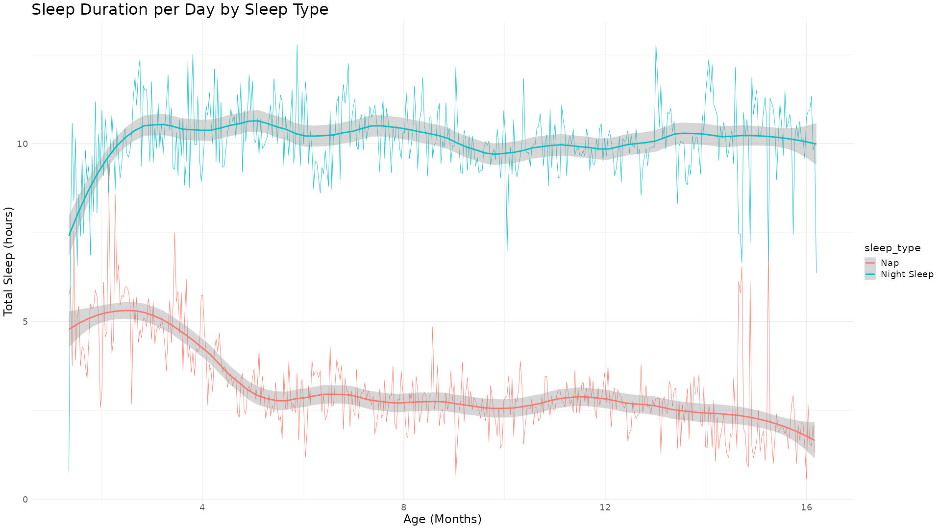 appears to have had a marginally positive impact on her sleep length. Post the 14-month mark, the
