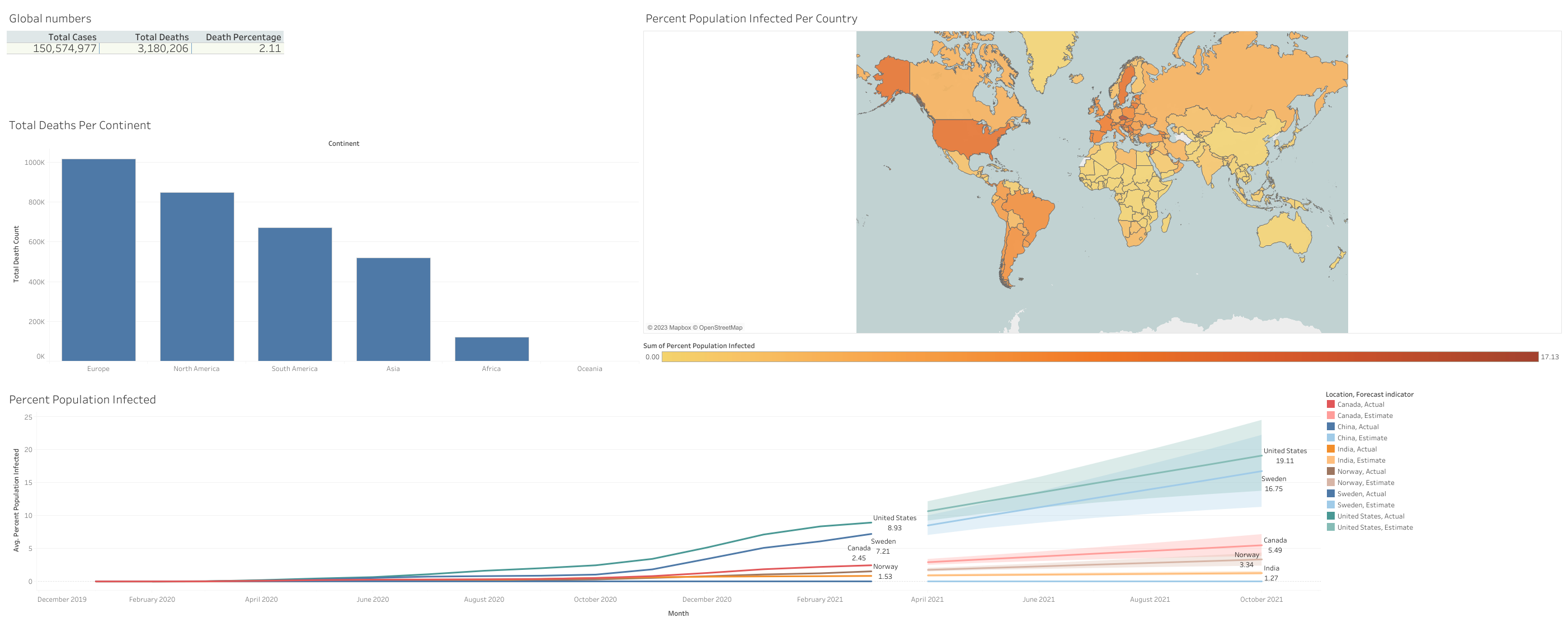 Covid 19 Deaths dataset visualization in Tableau.